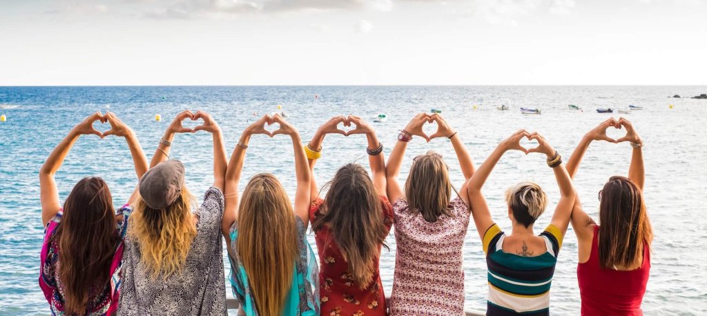 beautiful seven girls from the backside doing a heart with the hands looking at the ocean waiting the sunset in vacation leisure activity. friendship all together forever concept travel to sea party